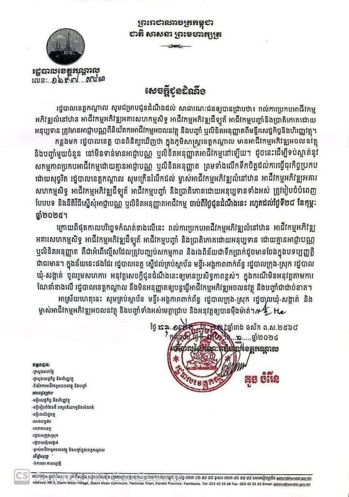 សេចក្តីជូនដំណឹង របស់រដ្ឋបាល ខេត្តកាល ចុះពីថ្ងៃ៣១ ធ្នូ២០២៤ បានឲ្យដឹងថា ដើម្បីទប់ស្កាត់ នូវសកម្មភាព ប្រកបអាជីវកម្ម ដោយគ្មានអាជ្ញាបណ្ណ ឬលិខិតអនុញ្ញាត ព្រមទាំងលើកទឹកចិត្តដល់ការធ្វើធុរកិច្ចប្រកប ដោយសុច្ចរិត រដ្ឋបាលខេត្តកណ្តាល ក្រើនរំលឹកដល់ម្ចាស់អាជីវកម្មអភិវឌ្ឍលំនៅឋាន អាជីវកម្មអភិវឌ្ឍន៍អគារ សហកម្មសិទ្ធ អាជីវកម្មអភិវឌ្ឍន៍ដីឡូត៍ អាជីវកម្មបញ្ចាំ និងប្រាតិភោគដោយអនុប្បទានទាំងអស់ ត្រូវរៀបចំបំពេញ បែបបទ និងនីតិវិធីស្នើសុំអាជ្ញាបណ្ណ ឬលិខិតអនុញ្ញាតអាជីវកម្ម ចាប់ពីថ្ងៃជូនដំណឹងនេះ រហូតដល់ថ្ងៃទី២៨ ខែកុម្ភៈ ឆ្នាំ២០២៥។