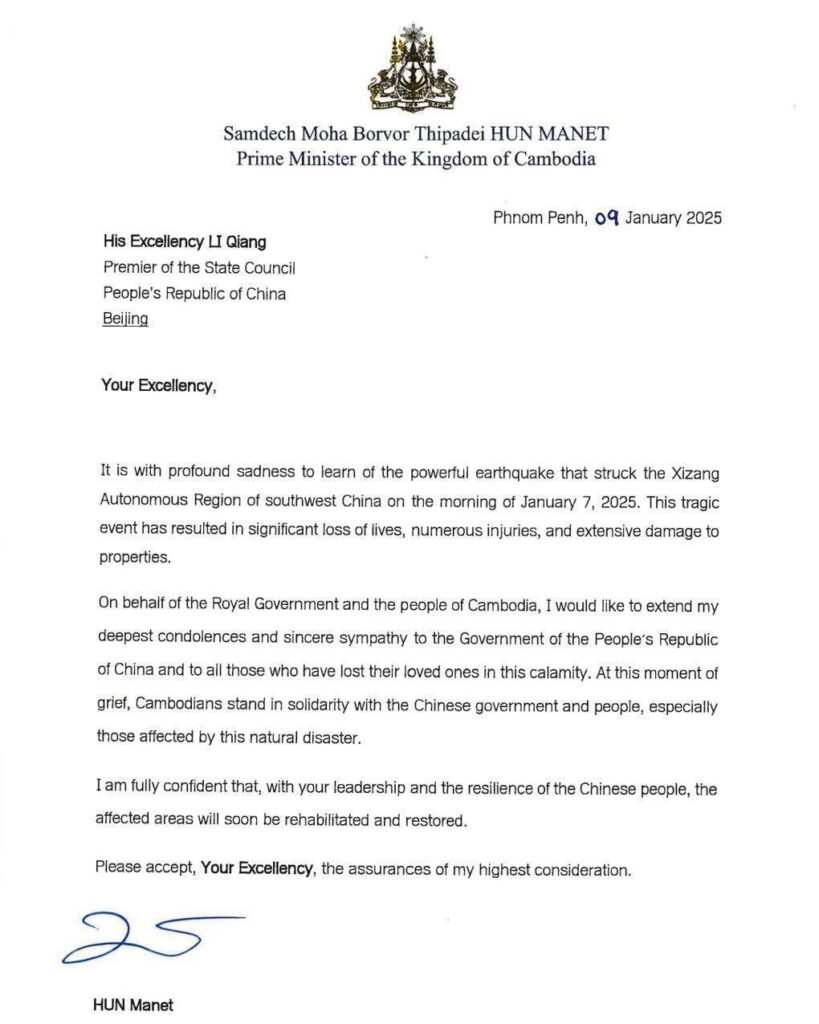 សម្ដេចមហាបវរធិបតី ហ៊ុន ម៉ាណែត ផ្ញើសារជូន ឯកឧត្តម លី ឈាង ចូលរួមសោកស្តាយពីគ្រោះធម្មជាតិរញ្ជួយដីនៅតំបន់ស្វយ័តស៊ីហ្សាង