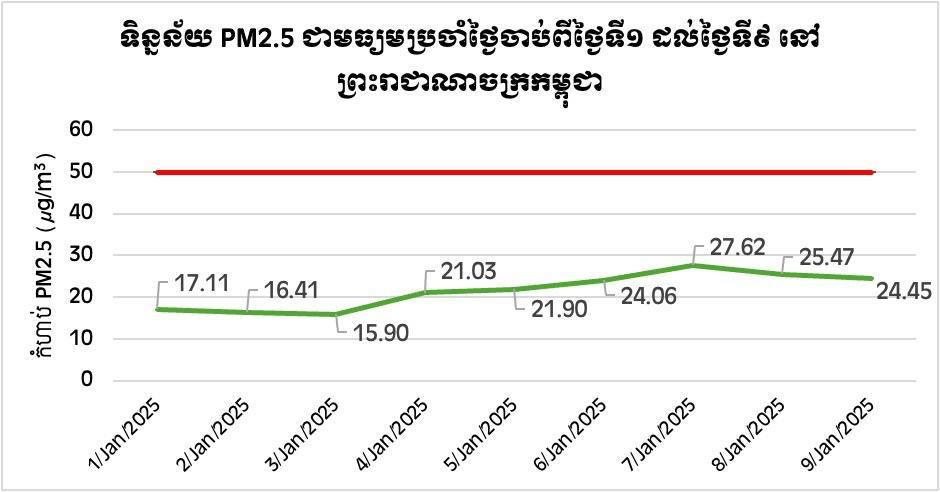គុណភាពខ្យល់ នៅកម្ពុជា បន្តភាពល្អប្រសើរ ដោយមកទល់ពេលនេះ មិនទាន់រកឃើញ កំហាប់ភាគ ល្អិតនិចល PM2.5 កើនឡើង ដល់កម្រិតប៉ះពាល់ ដល់សុខភាពគួរឱ្យព្រួយបារម្ភ ដូចប្រទេសជិតខាង នោះទេ នេះជាការបញ្ជាក់របស់ ឯកឧត្តម ខ្វៃ អាទិត្យា អនុរដ្ឋលេខាធិការ និងជាមន្ត្រីនាំពាក្យក្រសួងបរិស្ថាន ក្នុងសន្និសីទសារព័ត៌មាន កាលពីថ្ងៃទី១០ ខែមករា ឆ្នាំ២០២៥នេះ ។