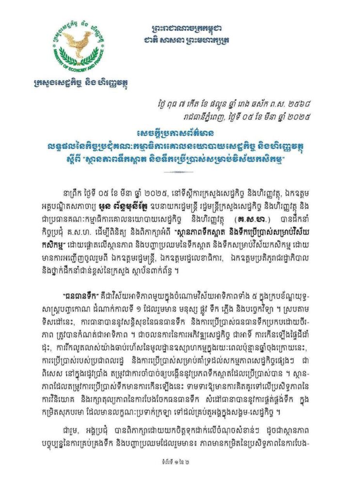 វិធានការចំពោះមុខសម្រាប់ដោះស្រាយបញ្ហាកង្វះទឹកក្នុងរដូវប្រាំងខាងមុខនេះ