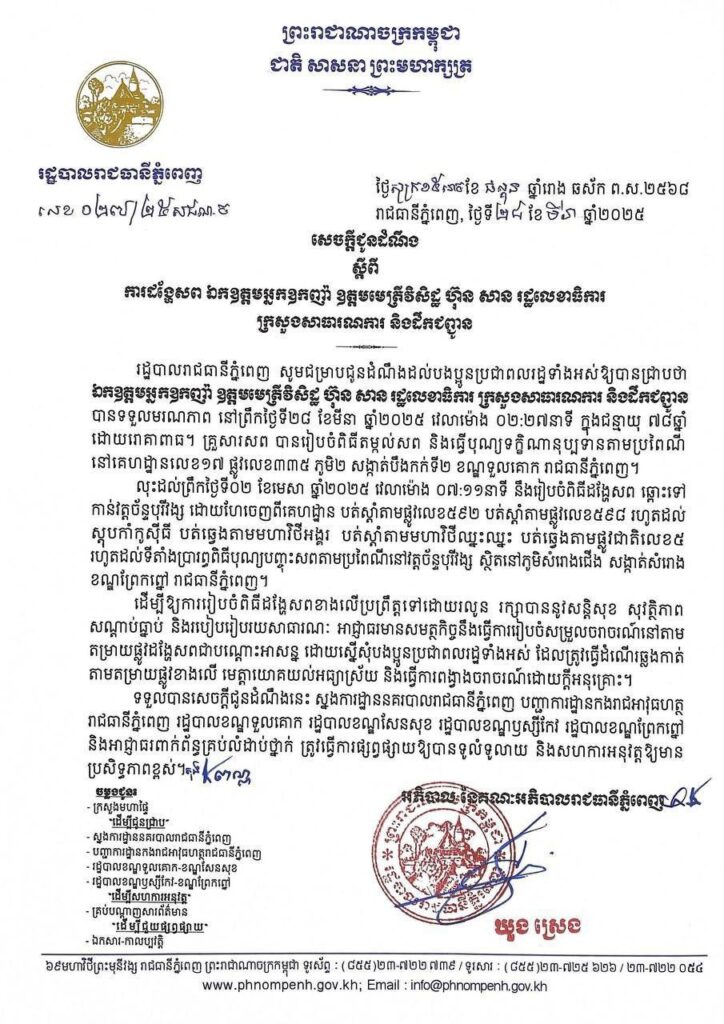 សេចក្តីជូនដំណឹង ស្តីពីការដង្ហែសព ឯកឧត្តមអ្នកឧកញ៉ា ឧត្តមមេត្រីវិសិដ្ឋ ហ៊ុន សាន