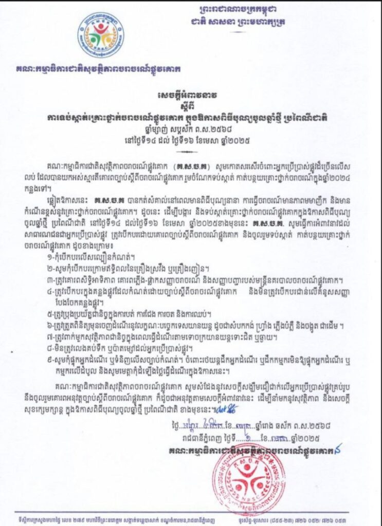 ដូចនេះ ដើម្បីបង្ការ និងទប់ស្កាត់គ្រោះថ្នាក់ចរាចរណ៍ផ្លូវ គោកក្នុងឱកាសពិធីបុណ្យ ចូលឆ្នាំថ្មី ប្រពៃណីជាតិ នៅថ្ងៃ ទី១៤ ដល់ថ្ងៃទី១៦ ខែមេសា ឆ្នាំ២០២៥ ខាងមុខនេះ គ.ស.ច.គ. សូមធ្វើការអំពាវនាវដល់ សាធារណជនជាអ្នក ប្រើប្រាស់ផ្លូវ ត្រូវបើកបរដោយគោរពច្បាប់ស្តីពី ចរាចរណ៍ ផ្លូវគោក និងចូលរួមទប់ស្កាត់ កាត់បន្ថយគ្រោះថ្នាក់ចរាចរណ៍ ផ្លូវ គោក ដូចខាងក្រោម៖