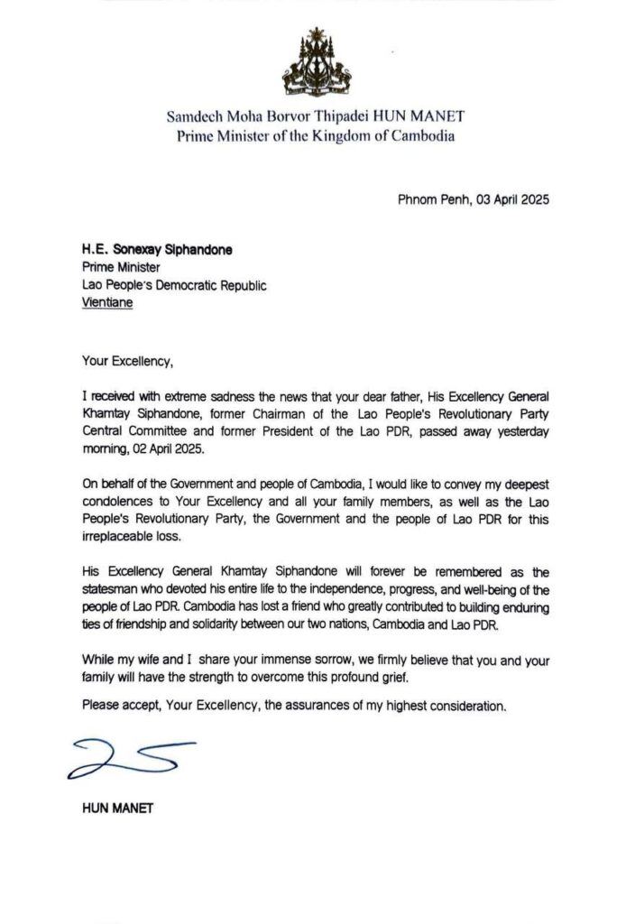 សារលិខិត រំលែកទុក្ខ របស់នាយករដ្ឋមន្ត្រីកម្ពុជា សម្តេចបវរធិបតី ហ៊ុនម៉ាណែត ចំពោះមរណ:ភាពអតីតប្រធានរដ្ឋនៃសាធារណរដ្ឋប្រជាធិបតេយ្យប្រជាមានិតឡាវ