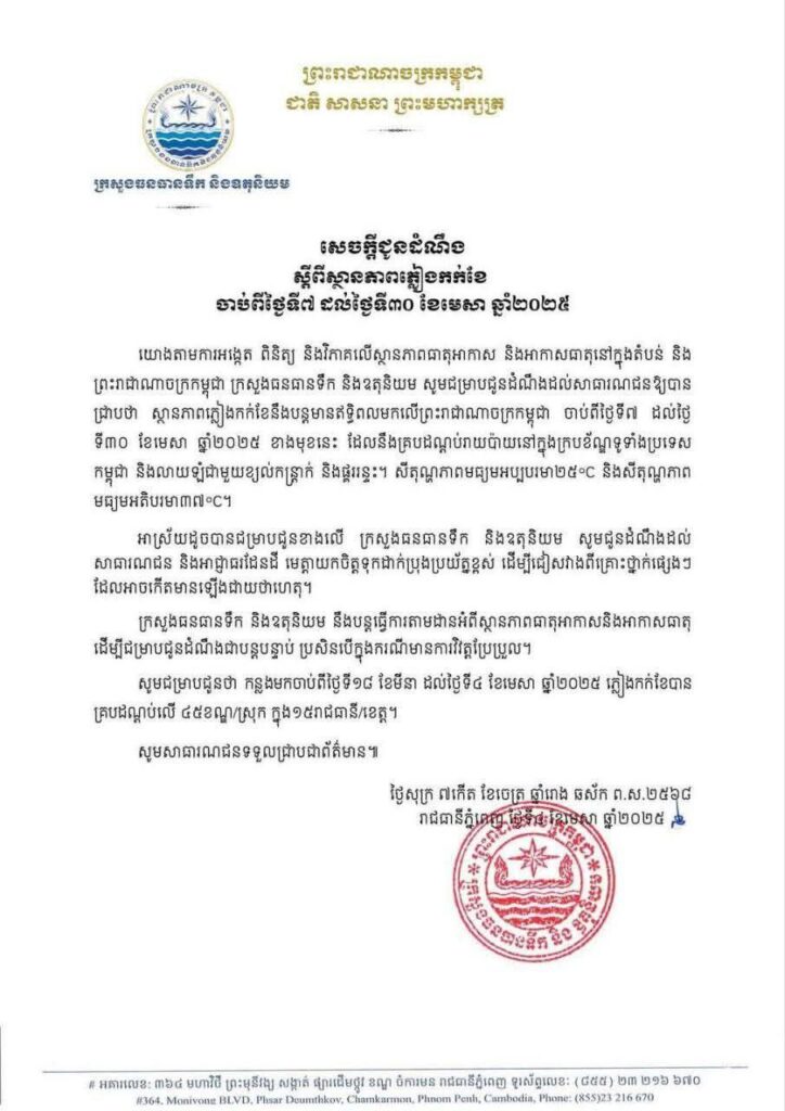 ភ្លៀងកក់ខែនឹងបន្តមានឥទ្ធិពលមកលើព្រះរាជាណាចក្រកម្ពុជា ចាប់ពីថ្ងៃទី៧ ដល់ថ្ងៃ ទី៣០ ខែមេសា ឆ្នាំ២០២៥ ខាងមុខនេះ