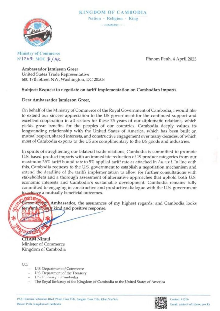 លោកជំទាវ ចម និម្មល រដ្ឋមន្ត្រីក្រសួងពាណិជ្ជកម្មកម្ពុជា សរសេរលិខិតផ្ញើទៅកាន់ឯកអគ្គរដ្ឋទូតសហរដ្ឋអាម៉េរិក លោក Jamieson Greer ដើម្បីចរចាជុំវិញវិធានការដំឡើងពន្ធគយរបស់សហរដ្ឋអាម៉េរិកលើទំនិញនាំចូលពីកម្ពុជា៕ អត្ថបទដោយ៖ cambodia-nation-media
