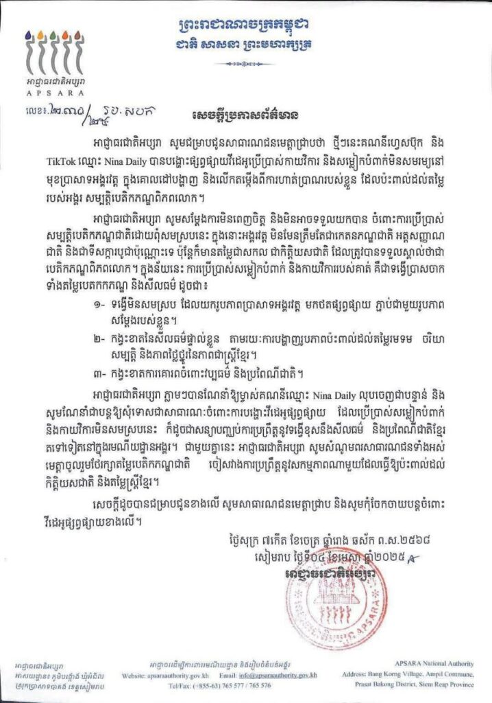 អាជ្ញាធរជាតិអប្បរា បានចេញសេចក្តីប្រកាសព័ត៌មាន ថាឈ្មោះ Nina Daily ផ្សព្វផ្សាយវីដេអូ ប្រើប្រាស់កាយវិការ និងសម្លៀកបំពាក់ មិនសមរម្យនៅមុខប្រាសាទអង្គរវត្ត